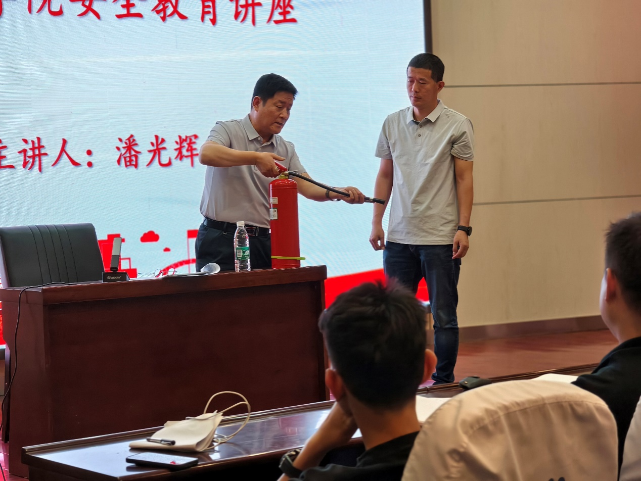 校保卫部部长潘光辉分别围绕人身安全,消防安全、财产安全、交通安全和预防电信诈骗五个方面的内容,结合发生在校园内的典型案例,进行了详细而生动的阐述。针对财产安全方面,他以多起校园财产安全失窃事件为例,提醒全体同学要提高财产安全意识,注意保护好自己的贵重物品,特别是日常一定要做到离开宿舍时随手关闭宿舍门,杜绝宿舍不锁门或者把钥匙插在门上等错误行为,切实保护好自己的财产安全;针对道路和交通安全,潘光辉对于学校近期开展校园电动自行车、摩托车管理,预防因电动自行车、摩托车引发的各类安全事故相关活动,进行了详细的解读。针对消防安全方面,他详细讲解了校园火灾常见的产生原因和火灾发生时如何正确的逃离火场的方法,还与王建峰一起在现场对灭火器的使用方法进行了生动的演示和细致的讲解;针对频繁出现的电信诈骗犯罪行为,潘光辉列举了诈骗分子常见22类诈骗手法,要求牢记“三不一要”,提高安全意识,不给犯罪分子可乘之机,把财产损失降到最低。