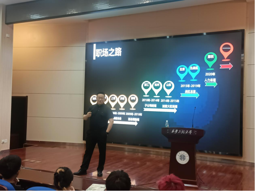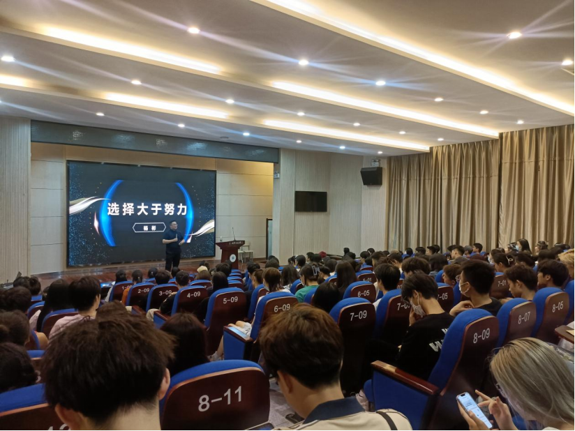 杨彬先生以自身职场经历为例,围绕“始于初心”、“忠于选择”、“重在坚持”等方面进行了生动的讲解,案例丰富、精彩实用。他鼓励同学们要进一步明晰梦想与现实的距离,学会独立思考,利用课余时间充实自己,规划好自己的大学生活,体会父母的辛苦,明白读书的意义,要领悟成长比职位更重要,能赚钱不等于值钱,想要在社会上立足,自律、自燃、自驱必不可少。