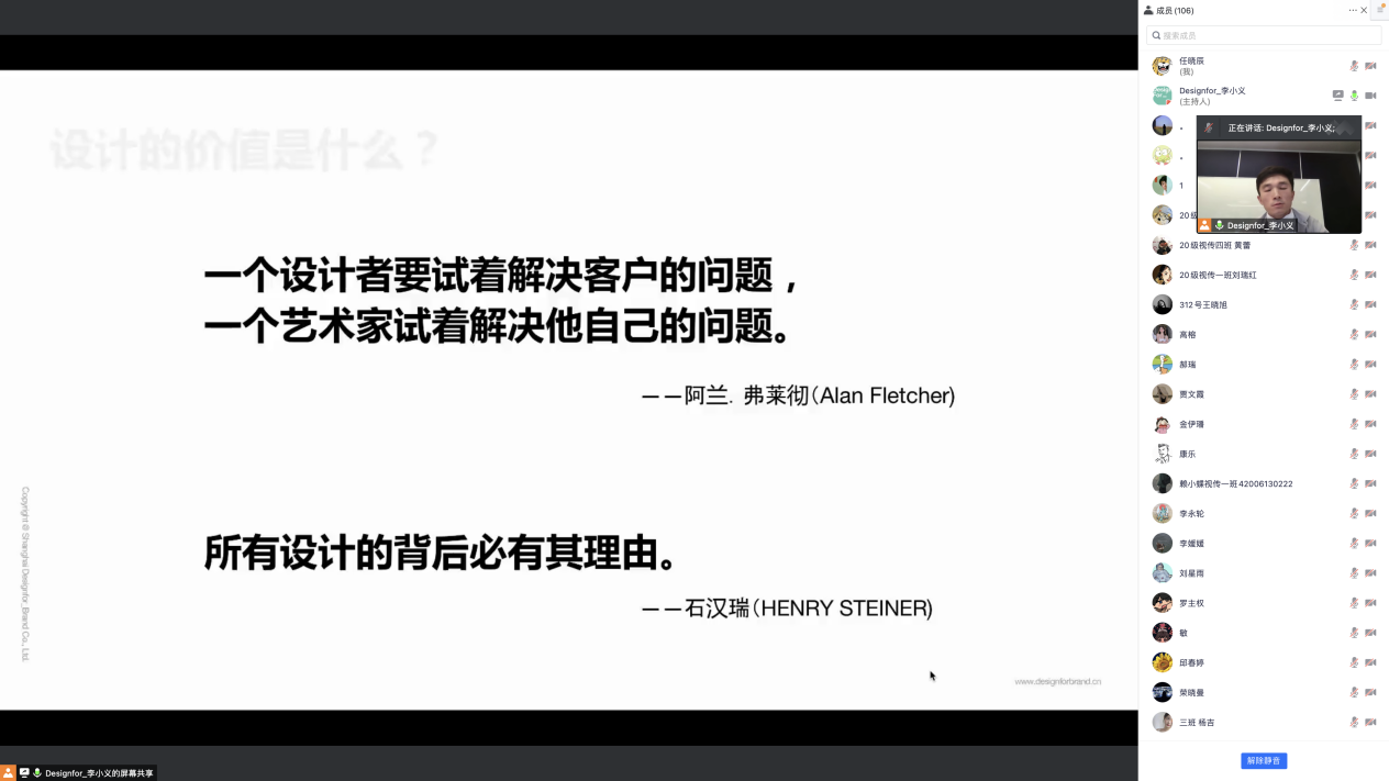 李小义老师从不同的商业项目和维度出发,分享他作为平面设计师在实践中身份的转换以及在设计中的专业经历,以图文并茂的形式对他从业之路中具有代表性的设计案例进行了生动细致的解读,李小义老师通过对部分商业品牌创意方法的分享,为我们带来了“360度全方位”的设计思考理论,从人的五感出发去解析品牌,学会看穿品牌的本质。同时还讲解了作为一个优秀的品牌设计师所需要经历的积累与历练。使同学们进⼀步感受到优秀的品牌设计对于企业来说的重要性和必要性。对同学们进⼀步理清品牌设计的策划及创意思路,设计及工作⽅法,提供了有益的借鉴。使同学们能够站在⼀个更⾼的起点去学习品牌设计。