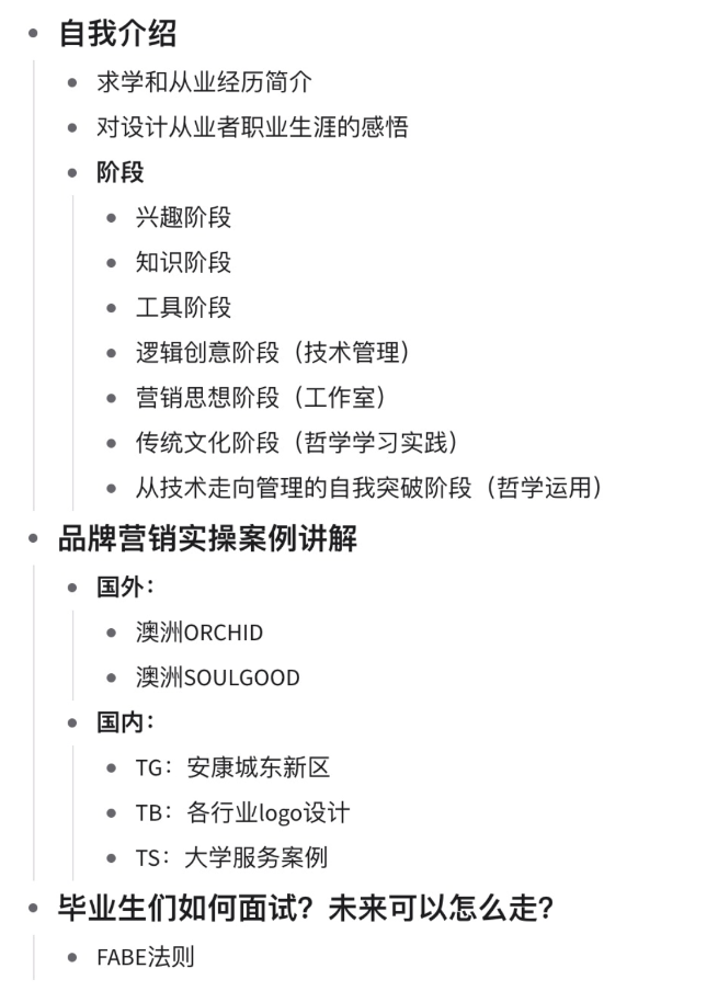 周亚楠老师结合自身的专业经历,分享了在品牌营销与品牌设计领域二十余年的从业经验,以图文并茂的形式为同学们进行了生动细致的解读,周亚楠老师通过部分品牌营销的实操案例,从兴趣、知识、工具、逻辑创意、营销思想、传统文化、技术走向管理等7个方面,分别讲解了作为一个优秀的品牌设计师所需要经历的沉淀与历练。最后为同学们讲述了FABE面试法则及诸多面试技巧,使同学们可以更好地了解用人单位的需求,从而结合自身特点提高竞争力。