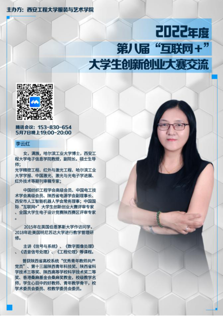 李云红教授系中国纺织工程学会高级会员、中国电工技术学会高级会员、全国大学生电子设计竞赛陕西赛区评审专家、中国国际“互联网+”大学生创新创业大赛评审专家。