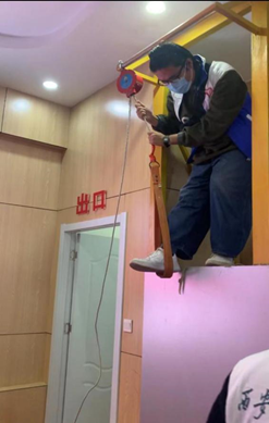 在消防教育基地的消防知识展厅,消防大队宣传员重点围绕如何预防火灾,不同种类的灭火器应该如何使用,以及日常生活中发生火灾时的急救方案等方面为同学们进行了讲解。在基地的交互社学习区,宣传员邀请老师和同学们体验了紧急疏散,绳索逃生,寻找火灾隐患和使用灭火器等互动体验项目,通过亲身感受,同学们对消防安全技巧有了进一步的认知。