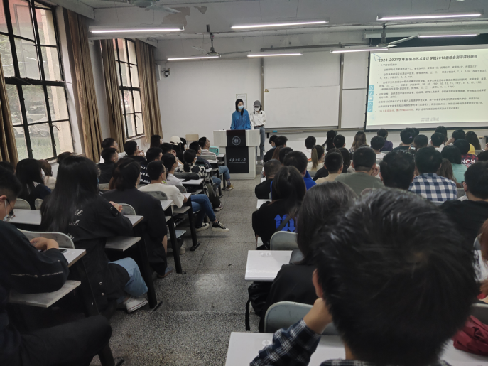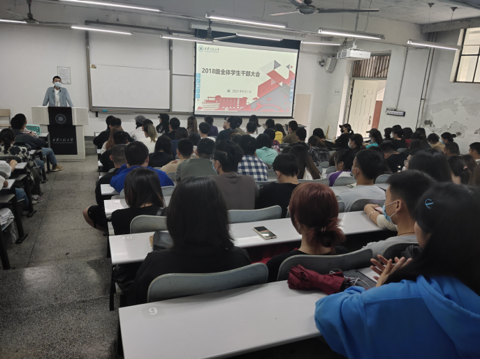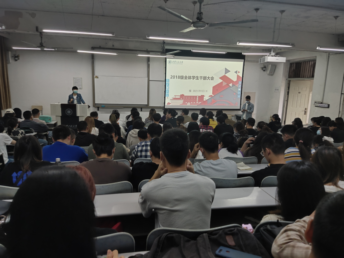 2018级在金花校区主楼126教室召开了新学期全体班干部大会,2018级辅导员马妍、蔺晓珣及全体学生干部180余人参加了此次大会。