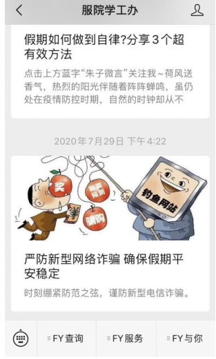 全体学子提供最及时、最权威的官方消息为宗旨,目前安排一名辅导员具体指导、学生团队负责日常运营。该平台自2018年8月31日创建以来共发布文章 620篇 ,累计粉丝达到8000余人,总阅读量70万余人次。“服院学工办”微信平台本着为学生服务的理念,积极关注学生学习生活的刚性需求和网络及社会热点,将思想政治教育原则与灵活的宣传策略相结合,以同学们喜闻乐见的形式和生动活泼的文风吸引服院学子广泛关注,在学生家长和教师中获得了较好评价,完成了占领主阵地、宣传主旋律的目的,达到了网络思政育人的效果。