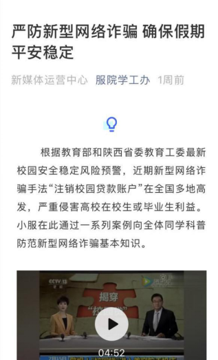 学工办认真开展工作,组织全面排查,通过线上多种渠道用一系列案例向全体同学科普防范新型网络诈骗基本知识,取得了较好的教育引导效果。