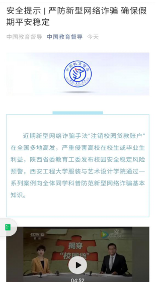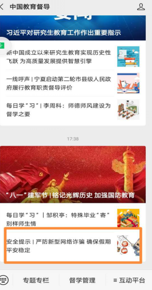 学工办微信平台公众号《严防新型网络诈骗 确保假期平安稳定》预警信息。“中国教育督导”是教育部教育督导局官方微信平台,旨在对作为基本教育制度之一的教育督导制度进行政策宣传、进行权威发布、介绍工作经验、打造交流平台。