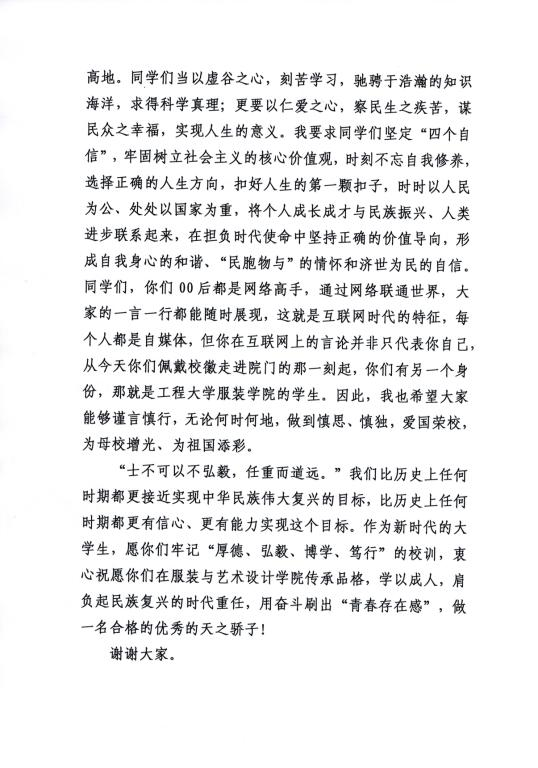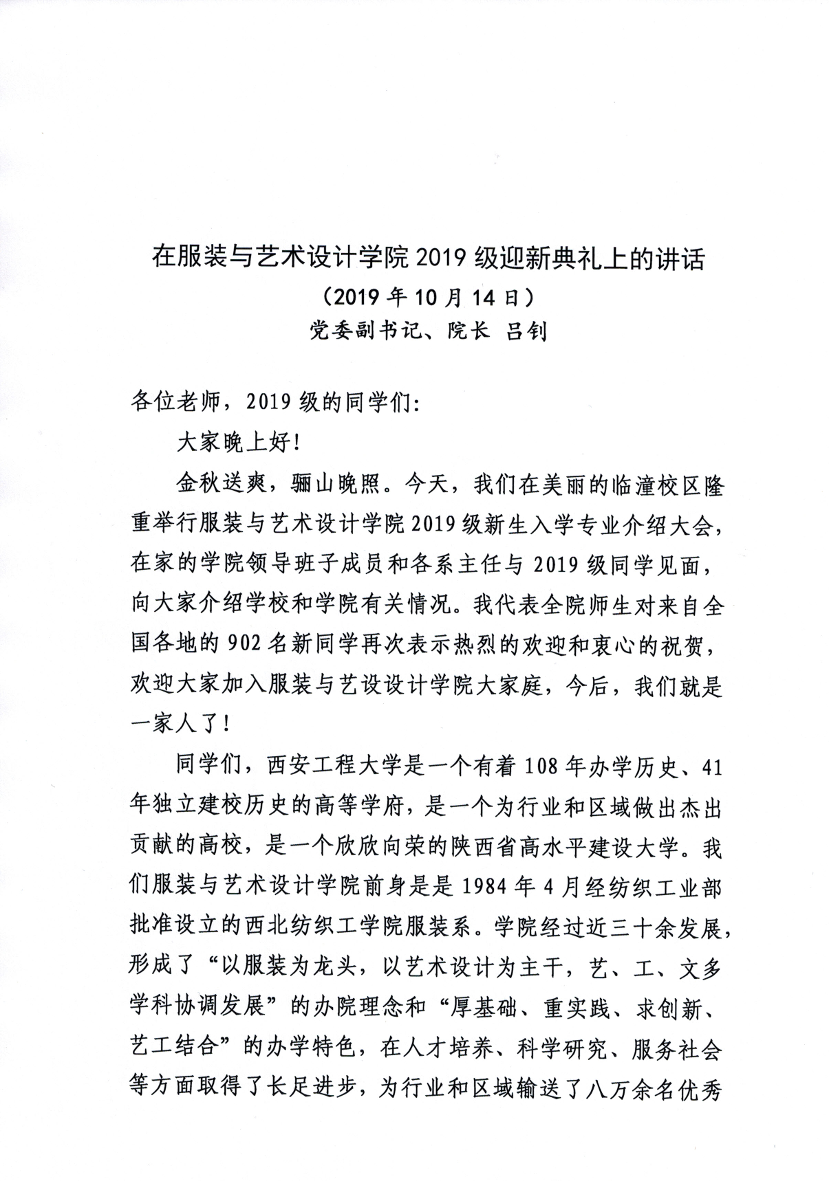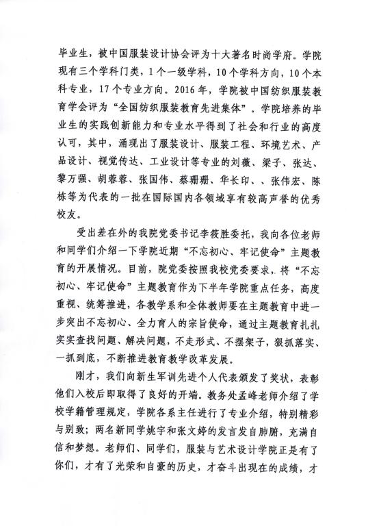 副院长袁燕希望2019级新生要学会自我管理,心存敬畏之心,继承传统文化,树立远大理想。学院服装设计系主任刘静等8位系主任和老师就相关学科和专业,通过PPT的形式进行了简练而精彩的介绍,对全体新同学提出了希望和要求,也使同学们受到了美的洗礼。新生代表姚宇、张文婷在发言中提出了自己对大学生活和规划,并提议全体新同学把握时间,学会思考与自我约束,积极实践,以实际行动实现自己的目标与梦想,回报母校与社会。