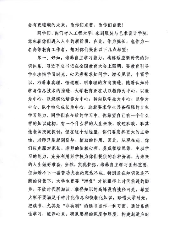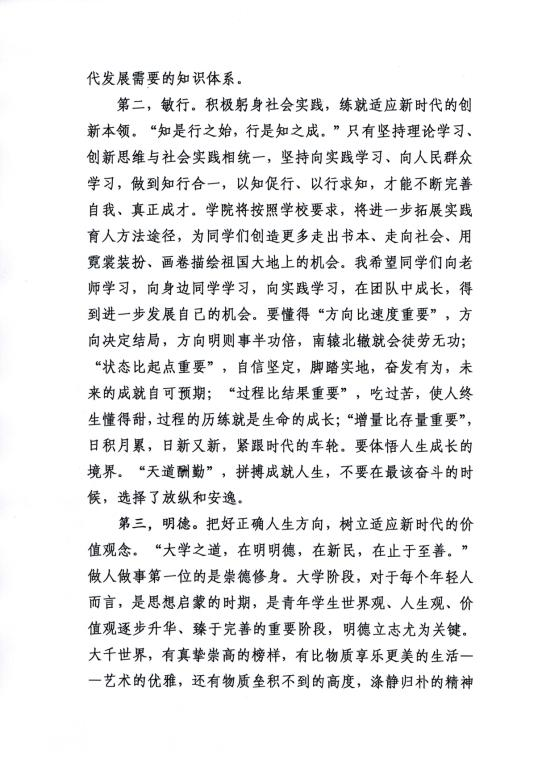 是一个有历史、有内涵的著名艺术殿堂和高等学府,培养出了一大批在国际国内各领域享有较高声誉的优秀校友,学院的光荣历史离不开老师同学们,学院的璀璨未来更需要靠大家共同创造。吕钊院长寄语2019级新同学,在大学期间努力培养自主学习能力,构建适应新时代的知识体系;积极躬身社会实践,练就适应新时代的创新本领;把好正确人生方向,树立适应新时代的价值观念。牢记校训、传承品格、学以成人,肩负起民族复兴的时代重任。为母校增光,为祖国添彩。