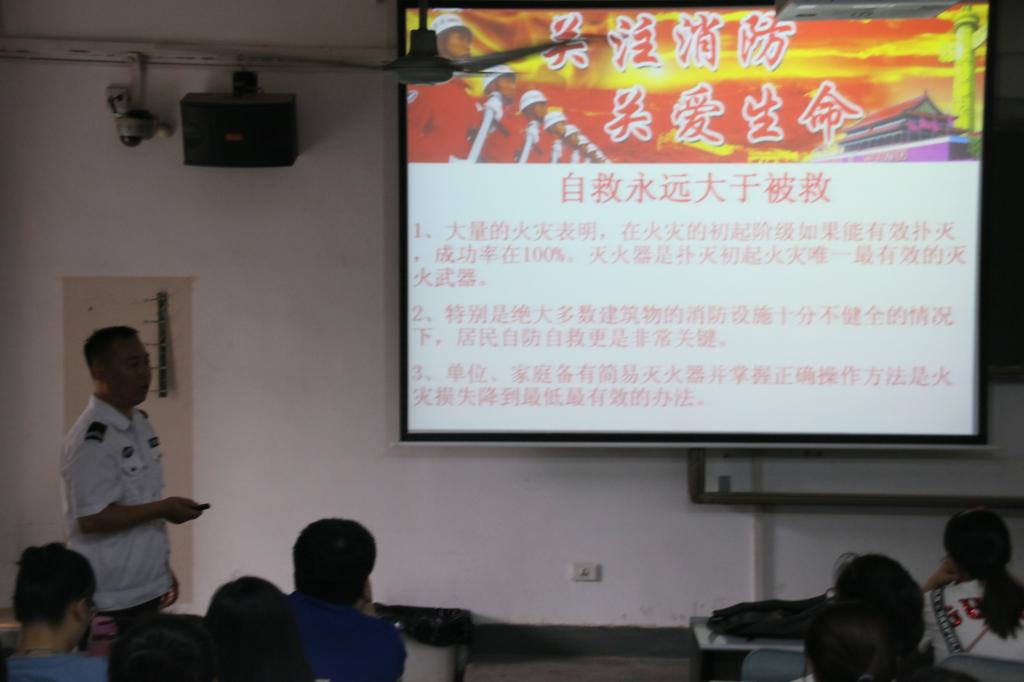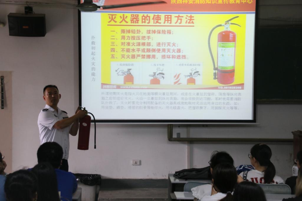讲座首先在主楼228教室举行。本次讲座的题目是《关注消防 珍爱生命》,由陕西翔安消防知识宣传教育中心的张甲元警官主讲。讲座伊始,张警官给大家播放了几段火灾事故的视频,给大家以警醒,使大家对消防的重要性有了深刻的认识。接下来,他给大家讲解了消防安全检查的内容,灭火器的使用方法,火灾的有关常识,火灾中的逃生方式,介绍了消防器材的具体种类,消防器具的使用方式,进一步增加了大家的消防知识,纠正了大家以往一些对消防的错误认识,使大家对消防有了更深刻和更具针对性的认识。