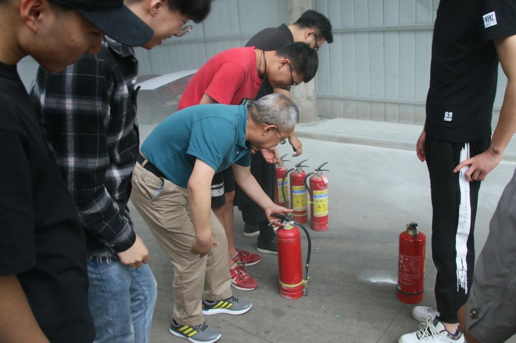 几位同学同时上手操练使用干粉灭火器