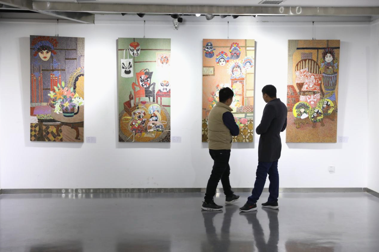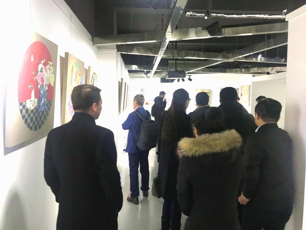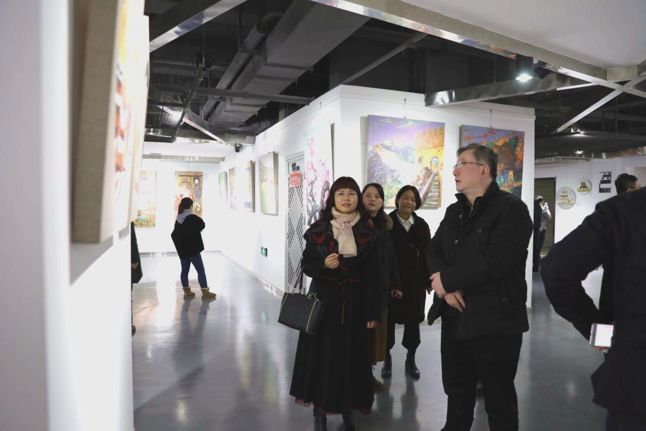 副校长樊增禄、教务处处长万明的同下参观我校时尚文化创意产业园,并在展览现场和陈欢欢同学深入交流油画的创作历程。