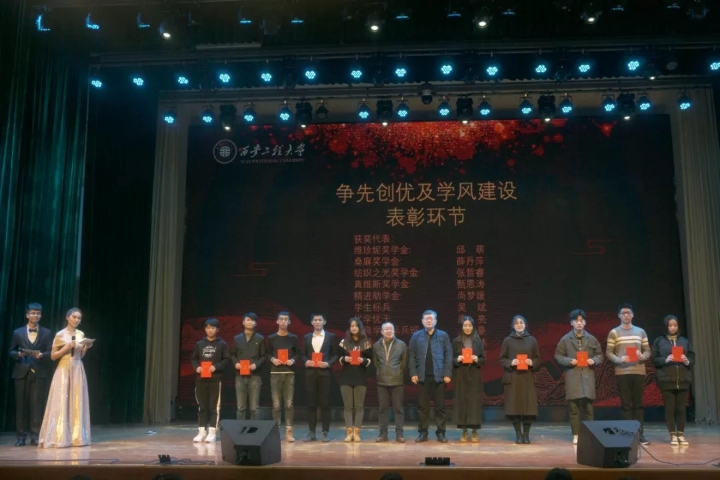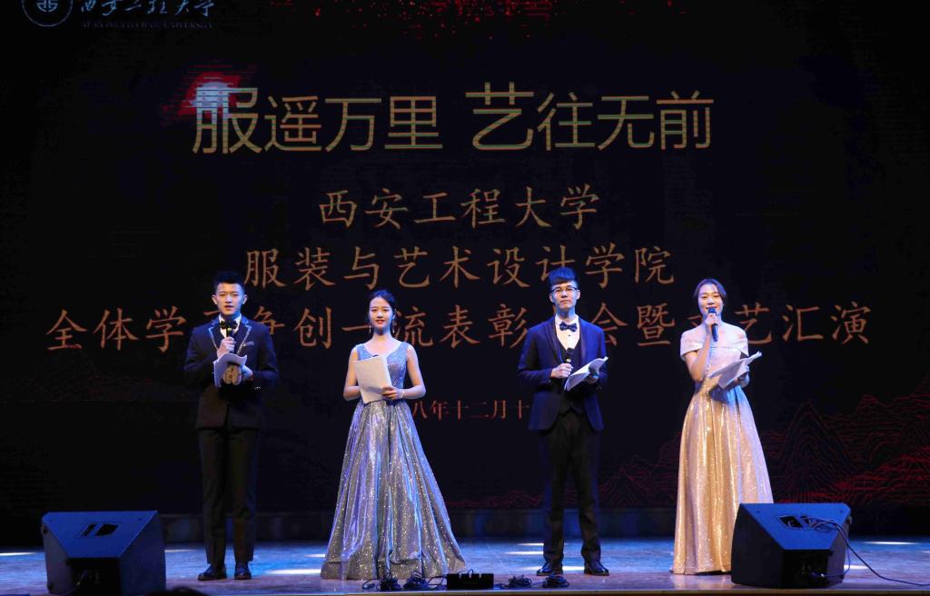 争创一流表彰大会暨“扶摇万里、艺往无前”文艺汇演分为“乐·长安梦华”“阅·历久弥新”“跃·继往开来”三个篇章展开,在每个篇章结束时对创先争优及学风建设、社会实践及各类竞赛、校园文体及志愿服务等方面获奖学生或集体代表进行表彰。2018年,全体服院学子激昂青春、砥砺前行、争创一流,在各个方面均取得了优异成绩,全年学生共获得各级各类奖励1000余项,获奖1500余人次,占学院学生总数三分之一强,仅参加校外科技学科竞赛就达300余项,获得高水平奖项200余项,不仅学生个人获得了成长和提升,更为学校和学院争得了荣誉,提升了学校和学院在全社会和纺织服装高等教育领域的知名度及影响力。