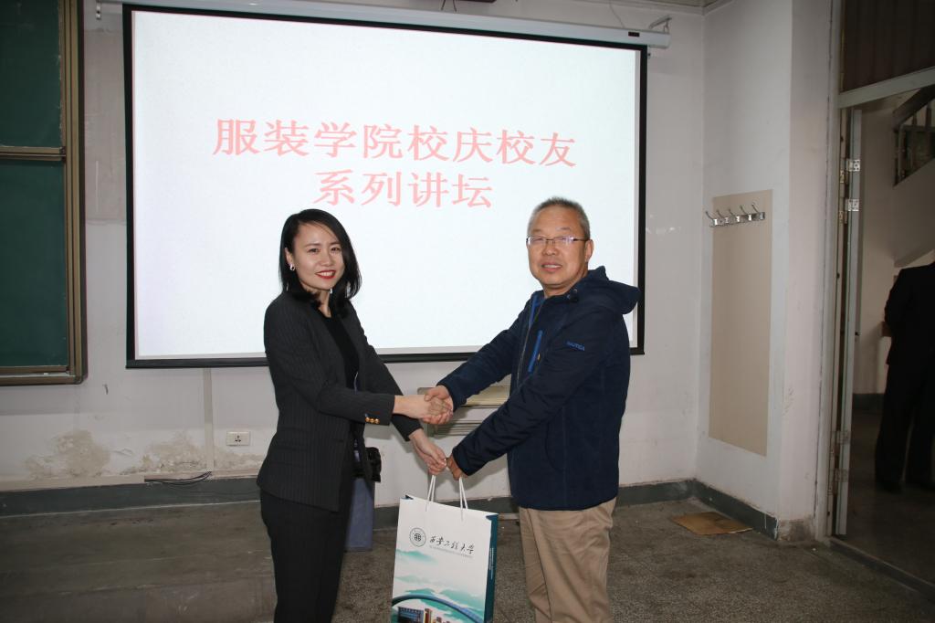 首先,服装商学系主任梁建芳老师向在场同学介绍本次讲座主讲人李娇。适逢我校独立建校40周年校庆之际,学院党委书记李筱胜在报告会正式开始前对校友李娇的到来表示热烈欢迎并向其赠送母校40周年校庆纪念品,邀请一同为工程大庆生。