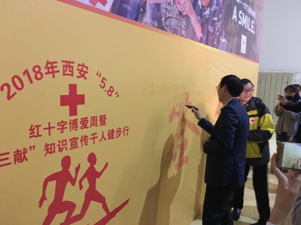 青分队副队长杨萌同学宣读动员造血干细胞志愿捐献倡议书:“流动的爱心不能等,只需要5~8ml的血量,你也能成为爱心使者。”随后校团委书记王晓先上台呼吁广大的青年志愿们继续秉承“奉献、友爱、互助、进步”的志愿精神,积极参与到红十字事业当中。临潼区副区长邹林同志也上台表示将联合高校为红十字事业努力做出更大的贡献。随后崔锦绣同志代表市红十字会为王浩公律师颁发了法律顾问聘书,并与上海金汇通用航空公司陕西分公司签订直升机救援框架协议。众嘉宾在签名墙上签名留念,为整个仪式画上句点。因雨势较大,健步行环节临时取消,所有嘉宾及活动参与者在发枪点合影留念并参加市中心血站无偿献血活动。