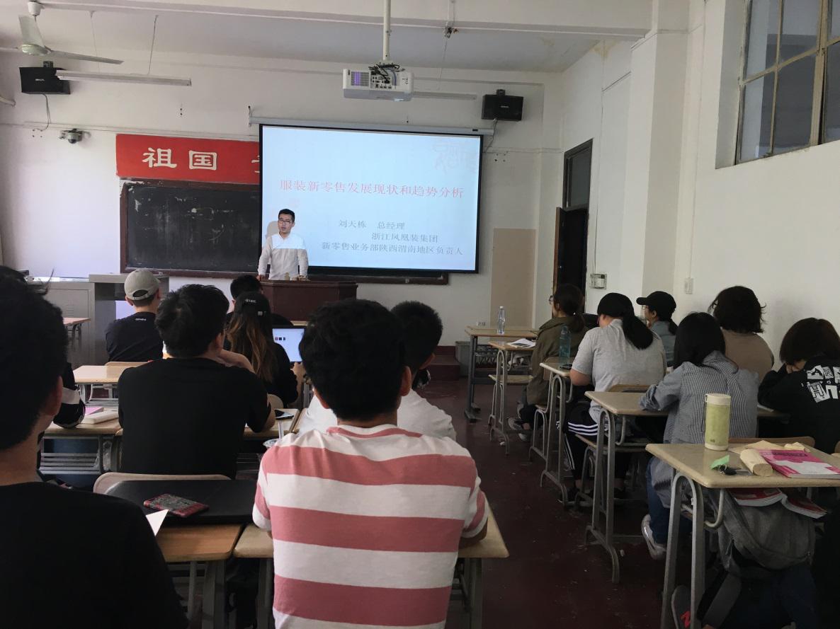 服装商学系于2018年4月20日邀请浙江凤凰庄纺织品有限公司新零售部陕西地区负责人刘天栋经理在主楼407教室做了“纺织服装新零售的现状和趋势分析”讲座。本次讲座由服装商学系主任梁建芳老师组织并实施,是《服装物流与供应链管理》课程理论学习的延伸和拓展,旨在进一步培养学生形成服装全产业链的全局思维、掌握服装产业核心竞争力的培养途径以及服装商业模式的变化趋势。2015级商学班全体学生参加了讲座并进行了充分的沟通和交流。