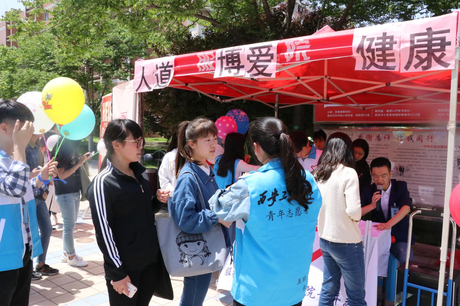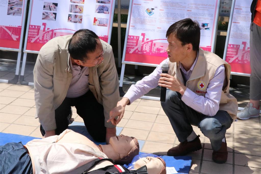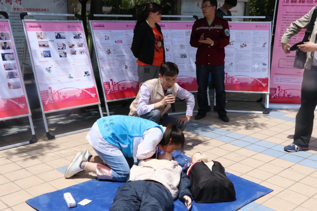 5月8日中午12时,在院青年志愿者分队李存正、牛玉宁和于思含三位同学的组织下,志愿者们在临潼校区中心广场组织了系列活动的现场宣传,临潼区红十字会的工作人员同时进行了精彩的心肺复苏(CPR)户外教学。刚下课的师生们纷纷驻足聆听,几位老师和学生还积极地上台操作演习。现场的学习气氛让大家对后续的活动充满期待。