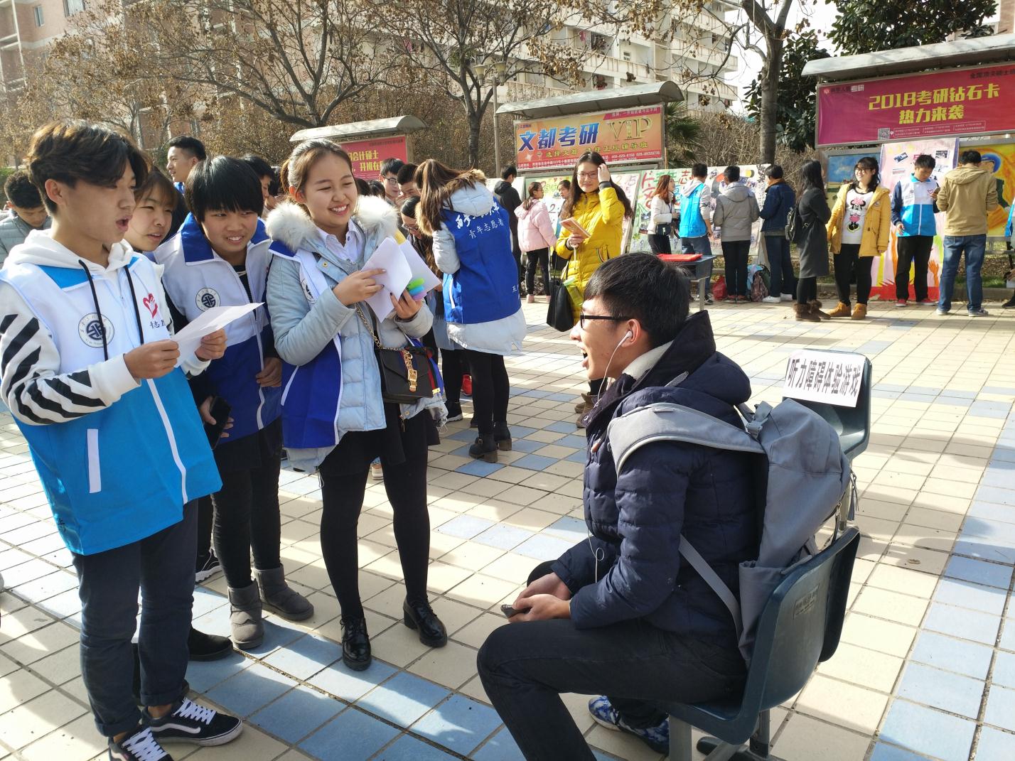 中午12点活动正式开始,首先来自各院的志愿者们合唱了《志愿者之歌》以此来吸引过往学生的注意,调动现场气氛,接着由各院志愿者分别向同学介绍各自队伍的工作历程,展示照片墙,并进行了签名活动也邀请同学们在意见栏中写下对志愿活动的意见和建议。主持人在介绍了国际志愿者日及志愿精神后向参与此次活动的同学们赠送了明信片,在此之后也邀请同学们参加了时光胶囊活动,写下对自己未来一年的话,并在明年的志愿者日领取胶囊,最后志愿者与同学分别进行了聋哑人、盲人、肢体残疾人和听力障碍人的体验游戏。为了彰显志愿主题,志愿者还开展了为期三天的教室清洁活动。