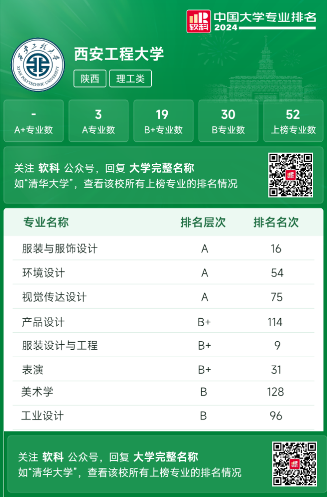 3个专业获得A级,分别是服装与服饰设计、环境设计、视觉传达设计。3个专业获得B+级,分别是服装设计与工程、产品设计、表演。美术学和工业设计获得B级。