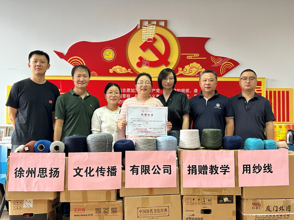 6月21日,徐州思扬文化传播有限公司无偿捐赠我校服装设计与工程专业教学用纱线十箱。企业联系人、我校谷秀洁老师,学院党委副书记马磊,学工办主任蔡洋,专业教师单凌、李宁、刘均,辅导员邵巍参加了捐赠仪式。
