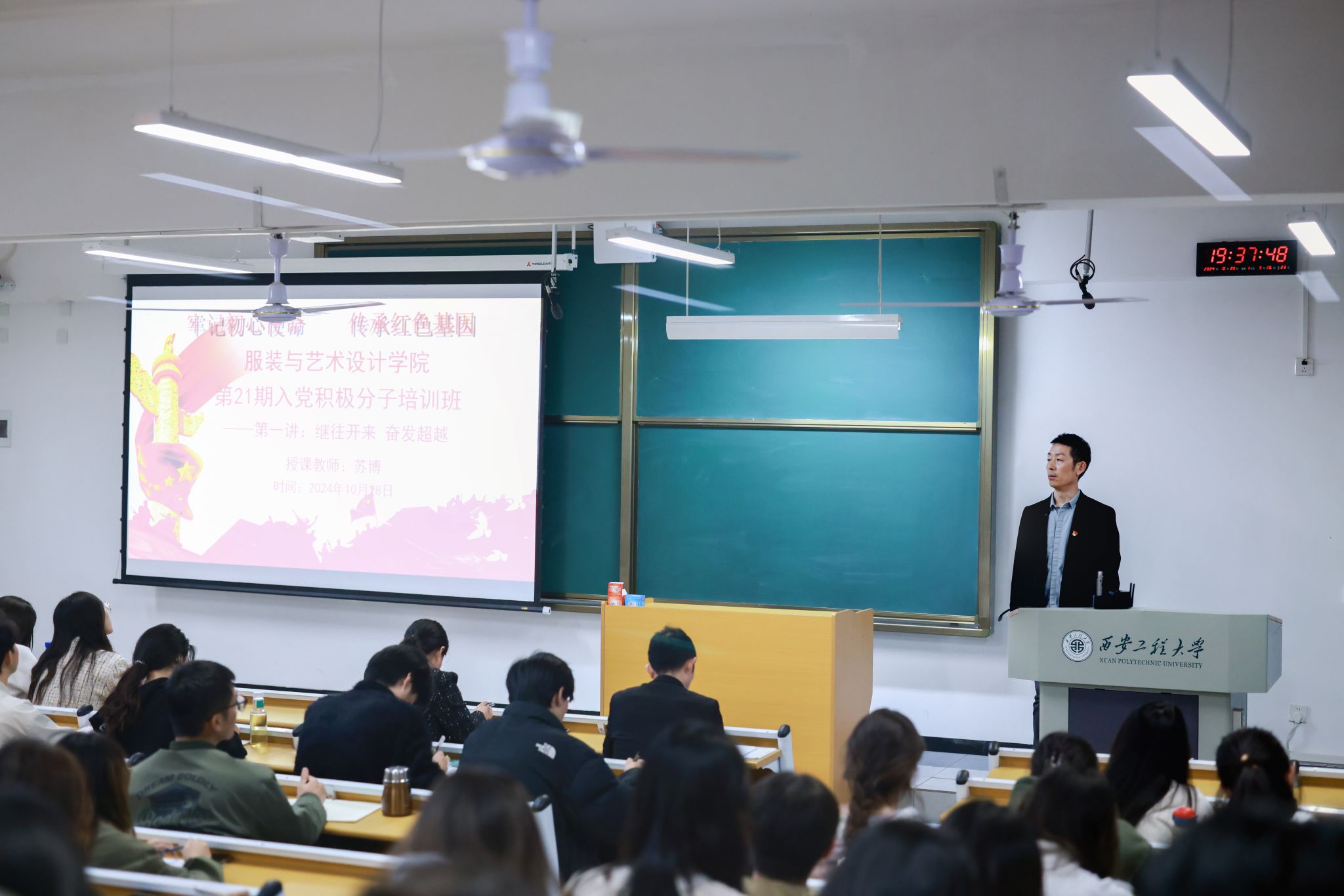 随后,苏博以“中国共产党为什么能”为主线,为21期入党积极分子讲授了一堂生动的党课。在课程中,苏博总结和阐述了党的百年奋斗的辉煌成就,以生动的史实案例,与全体学员一起探讨为什么中国共产党能够领导中国人民创造无与伦比的“中国奇迹”,引导全体学员深入理解中国共产党的力量源泉和初心与使命。要求全体同学务必了解并在生活中贯彻党的宗旨,不忘全心全意为人民服务的宗旨,坚定理想信念,听党话跟党走,勇于奉献,积极担当,做新时代最美大学生。