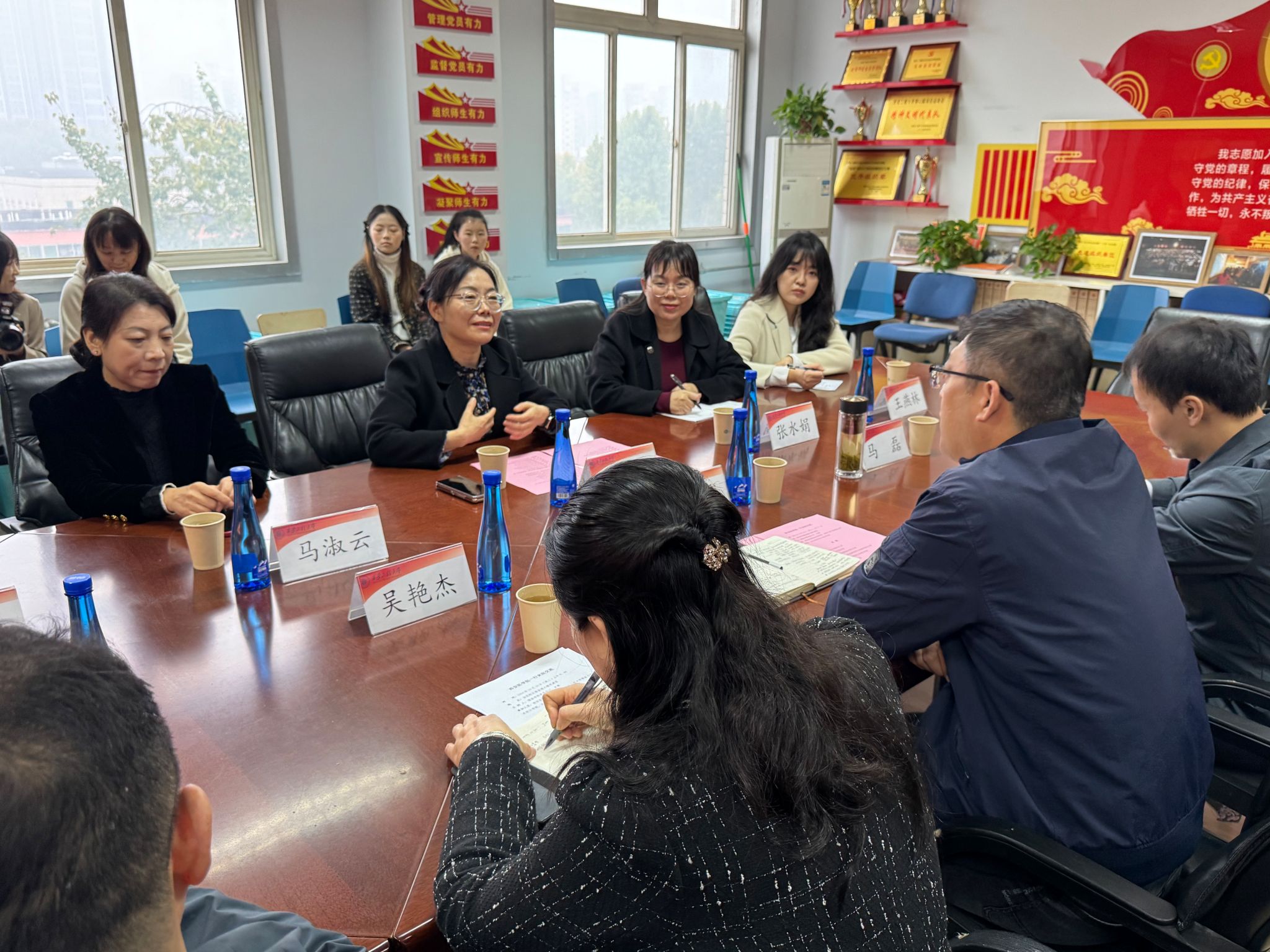 交流党建双创工作。院党委书记苏博、副书记马磊、副处级组织员吴艳杰、教工和学生党支部书记代表等参加交流,苏博主持会议。