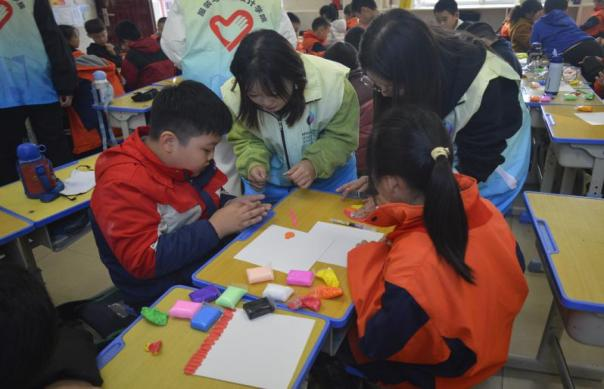 的青年志愿者们满怀热忱,奔赴临潼区康复路小学,成功开启了本学期第五次美育润心特色社团课程之旅。此次课程以“指尖艺动,与泥同行”为主题。旨在用超轻黏土帮助小学生们探索创意粘土画的无限魅力。青年志愿者们耐心地向小朋友们传授超轻黏土的基本技巧,从温柔地揉捻细腻的泥土,到精准地拿捏每一个细节。每一个步骤都进行了详细的示范与讲解。在传授技艺的同时,他们还巧妙地分享了色彩搭配的秘密,将艺术的种子悄然播撒在孩子们纯真的心田。