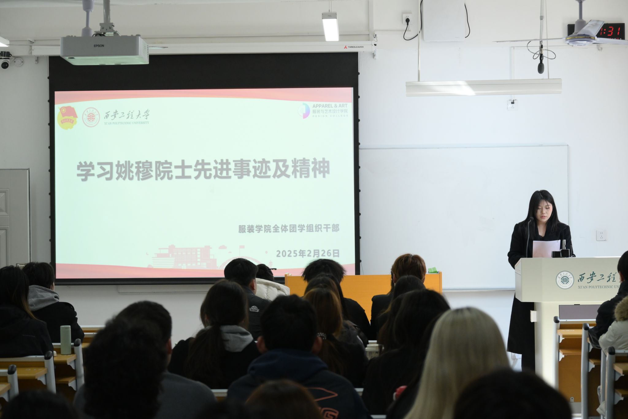 大会上,学院团委主席团成员穆亚男和团委社团管理部刘思琦先后登台,她们带领大家共同学习姚穆院士的先进事迹及高尚品格。发言中提到,姚穆院士作为我国纺织领域的杰出科学家,一生致力于纺织材料与纺织品的研究,不仅在学术上取得了卓越成就,更以其高尚的品德和无私的奉献精神,成为了广大师生心中的楷模。穆亚男和刘思琦通过领学发言,将姚穆院士的奋斗历程和光辉形象展现在大家眼前,激发了在场师生的强烈共鸣。