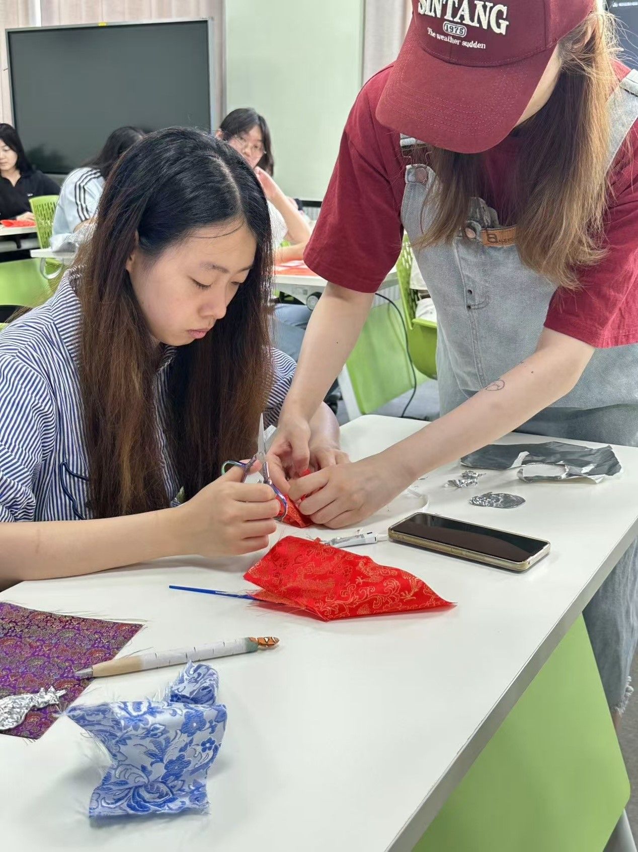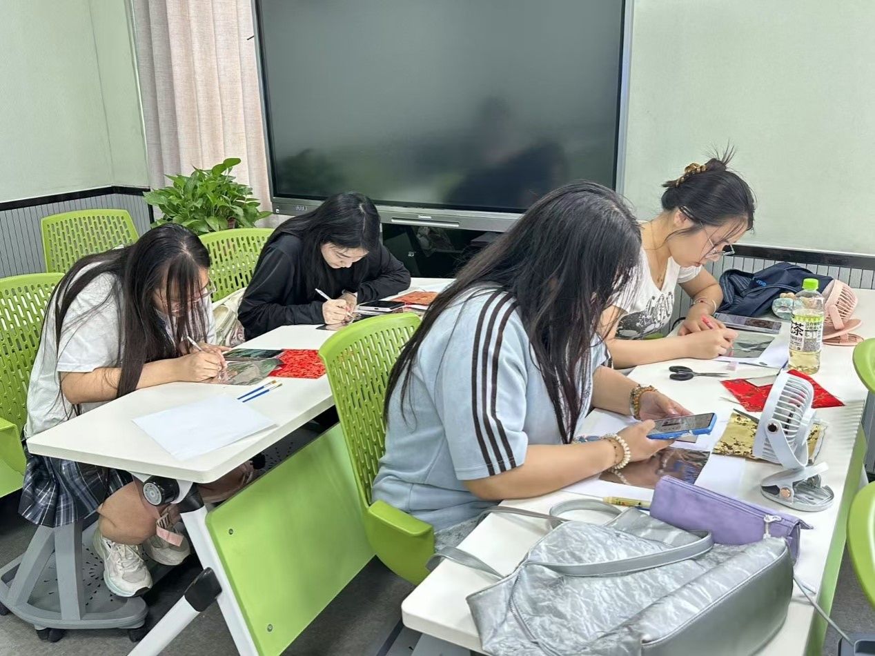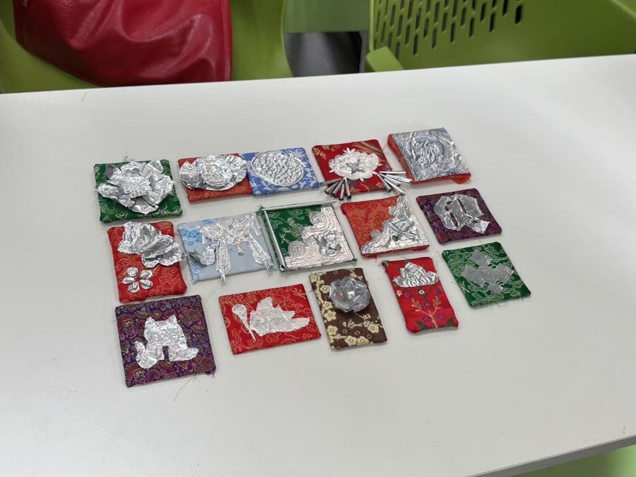课堂上,指导老师夏欣仪(特邀独立设计师)详细讲解了侗族银饰的文化背景和纹样特点,并指导同学们利用锡纸、纸板等材料,亲手制作侗族银饰风格的冰箱贴。同学们积极参与,发挥创意,精心裁剪、绘制图案,并将其粘贴成型。最终,一枚枚独具匠心的作品在大家手中诞生。