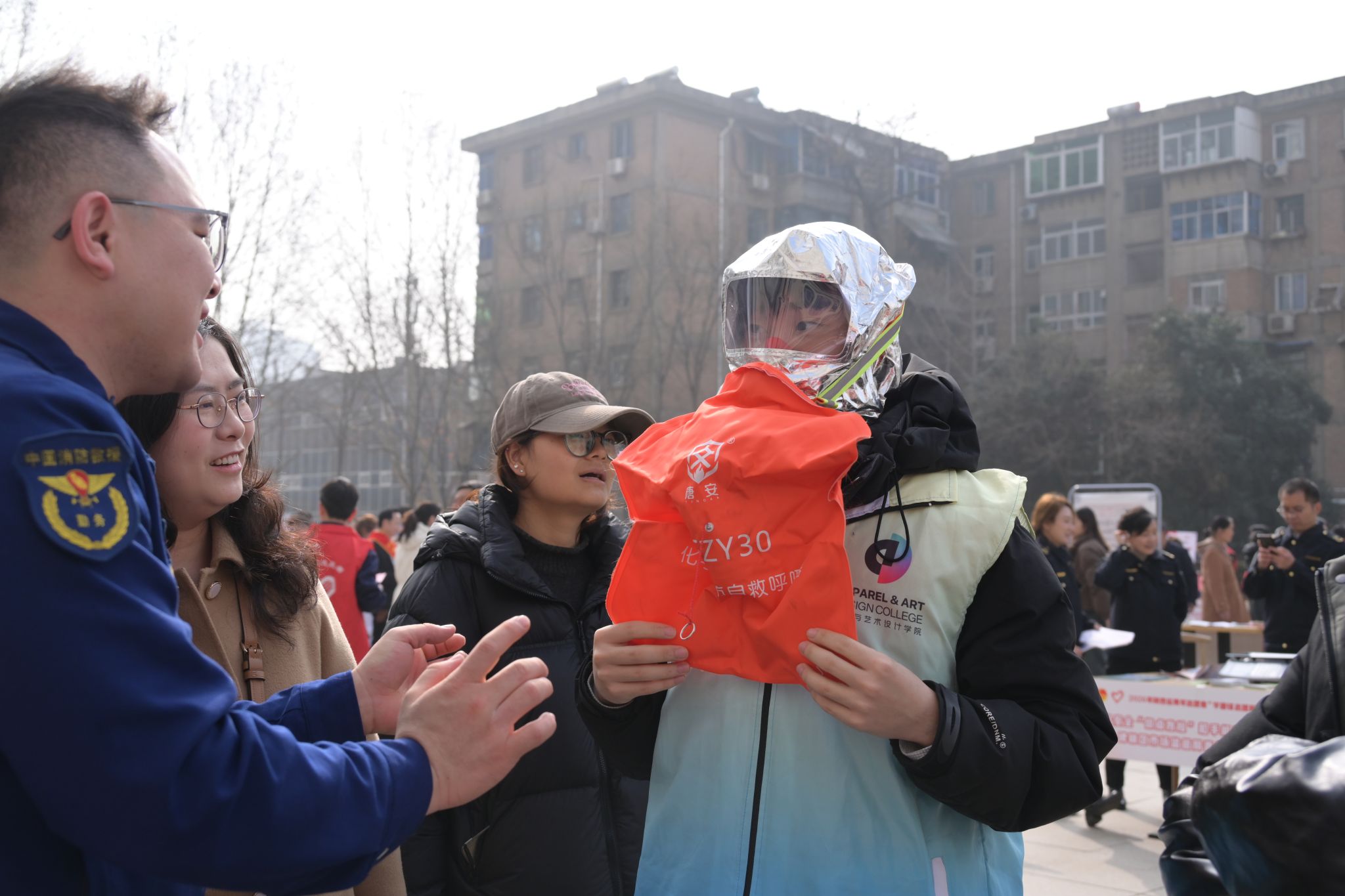 党委副处级组织员吴艳杰到场参加,学院团委马薏雯、孙晨倩和黄博宇指导学院青协联合碑林区金花北路消防救援站开展消防科普服务。消防员魏万胜、牛超专业讲解防火知识,演示灭火器、防烟面罩的使用方法。志愿者们利用专业知识,设计并制作了消防宣传T恤,宣传册,表情包等,通过自制消防宣传文创产品与宣传资料与居民积极互动,营造了良好的服务氛围。