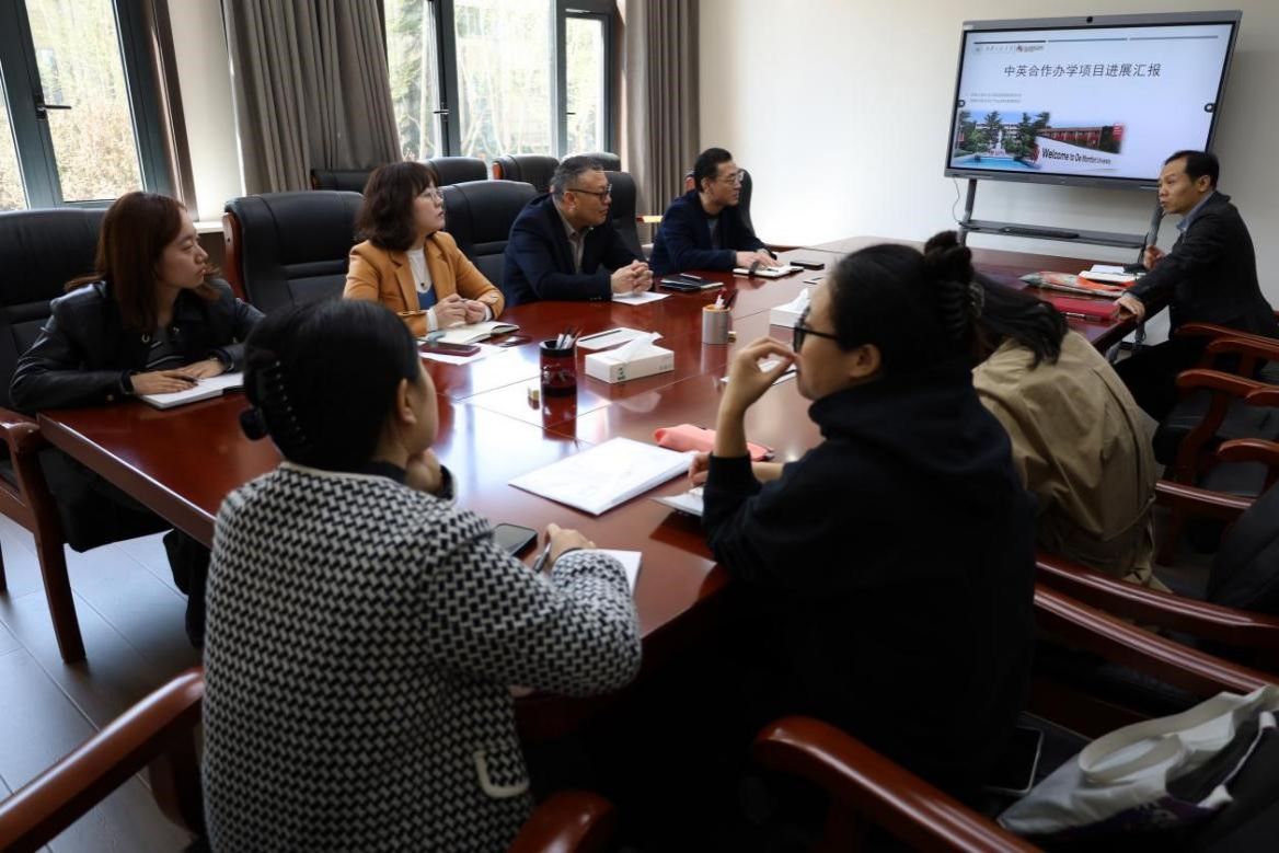 中英合作办学项目工作开展情况。国际处负责人、中英合作办学项目执行主任、项目组教师及教辅人员陪同调研并参加座谈。