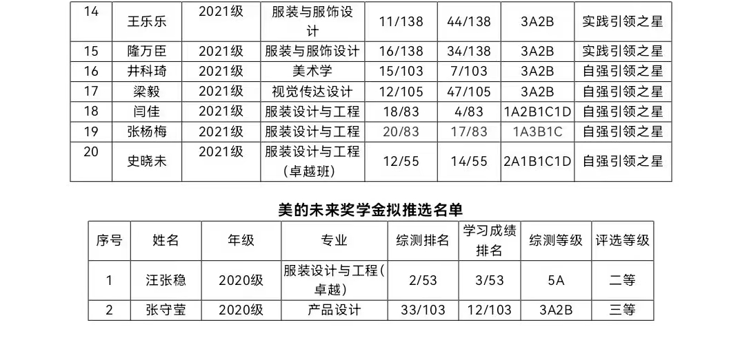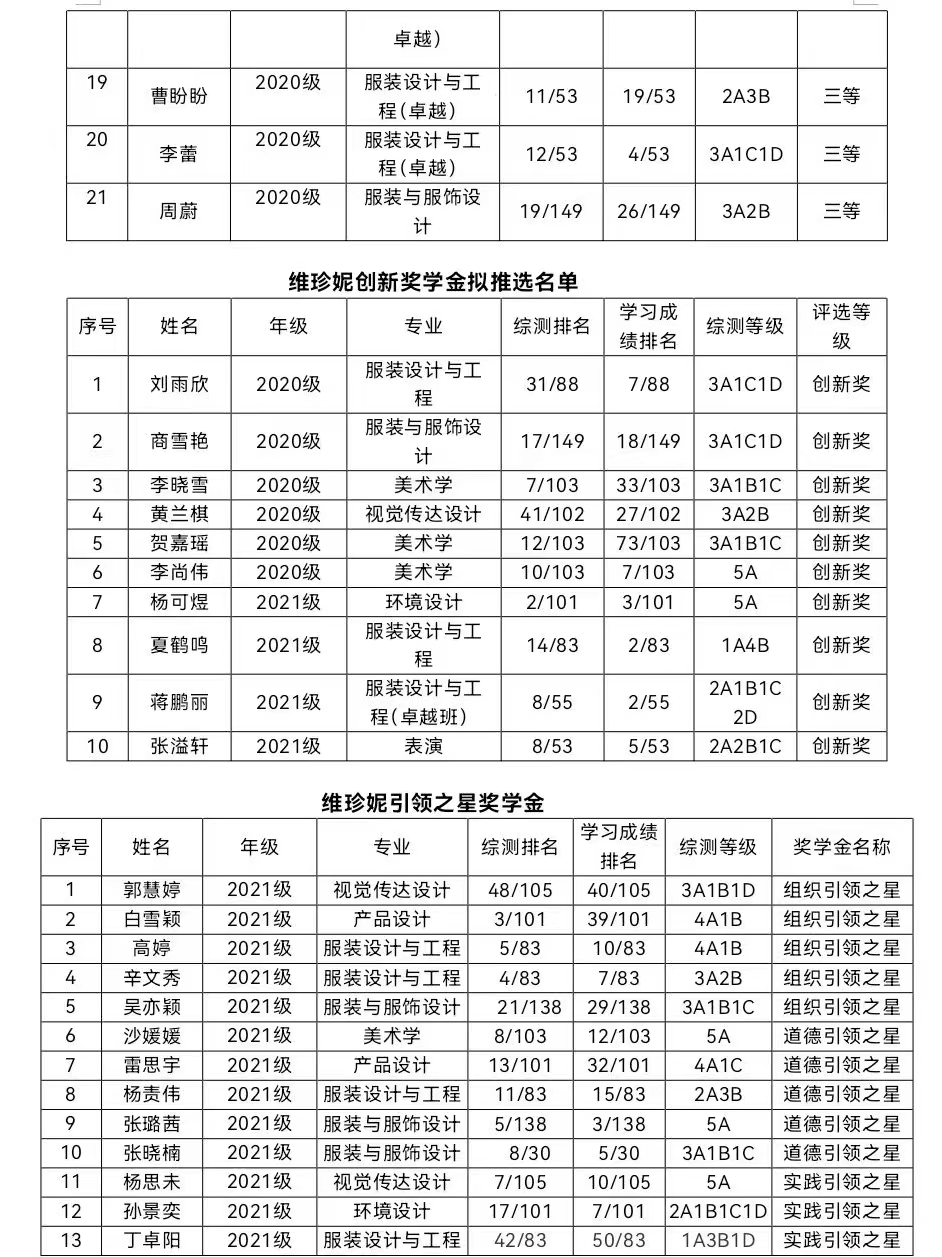 评选安排,名额分配为:2020级“维珍妮优秀学生奖学金”名额为21名,其中具体奖项分配名额为(一等奖5名、二等奖8名、三等奖8名)。“美的未来奖学金”二等、三等各1名。“维珍妮创新奖学金”6名;2021级“维珍妮引领之星奖学金”名额为20名,其中具体奖项分配名额为(组织引领奖5名、道德引领奖5名、实践引领奖5名、自强引领奖5名)。“维珍妮创新奖学金”名额为4名。经各年级初评,资助领导小组讨论,党政联席会通过,现将评选名单进行公示。公示时间为2021年11月27日至11月29日。如有异议,请于公示时间内向所在年级辅导员反映。
