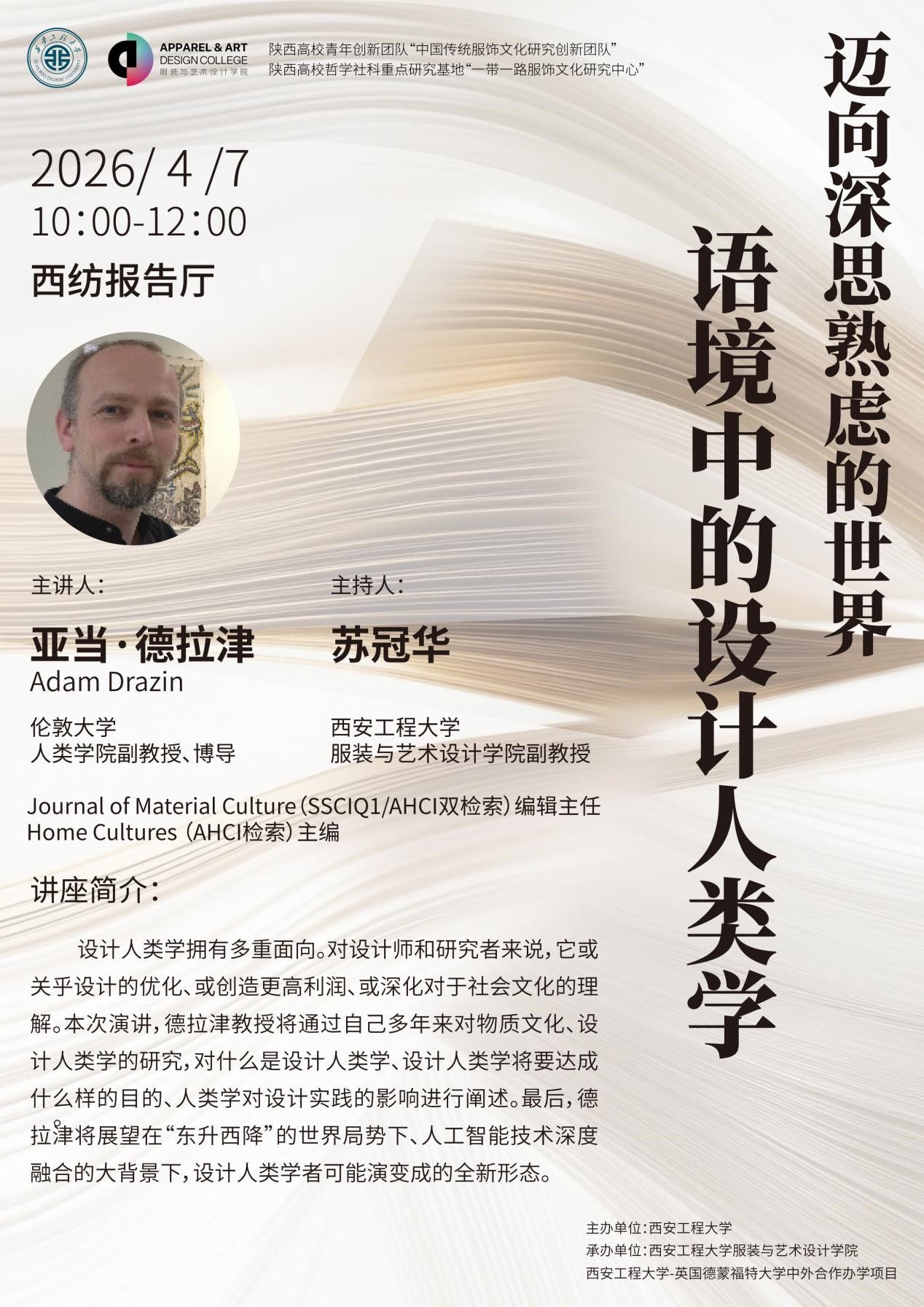 亚当·德拉津(Adam Drazin),1970年生,伦敦大学(University College London, QS世界排名第9)人类学院副教授、博导,设计人类学资深专家。物质文化研究顶刊、SSCI一区/AHCI双检索期刊《物质文化学刊(Journal of Material Culture)》编辑主任,AHCI期刊《家居文化(Home Cultures)》主编。伦敦大学人类学博士,研究领域聚焦日常物质文化、服饰人类学、设计人类学,曾主持惠普实验室、英特尔设计人类学研究项目,目前研究聚焦数字时尚中的设计体验。其最新著作Design Anthropology in Context(语境中的设计人类学)的中文版于2024年由江苏凤凰美术出版社“凤凰文库·设计理论研究系列”出版。
