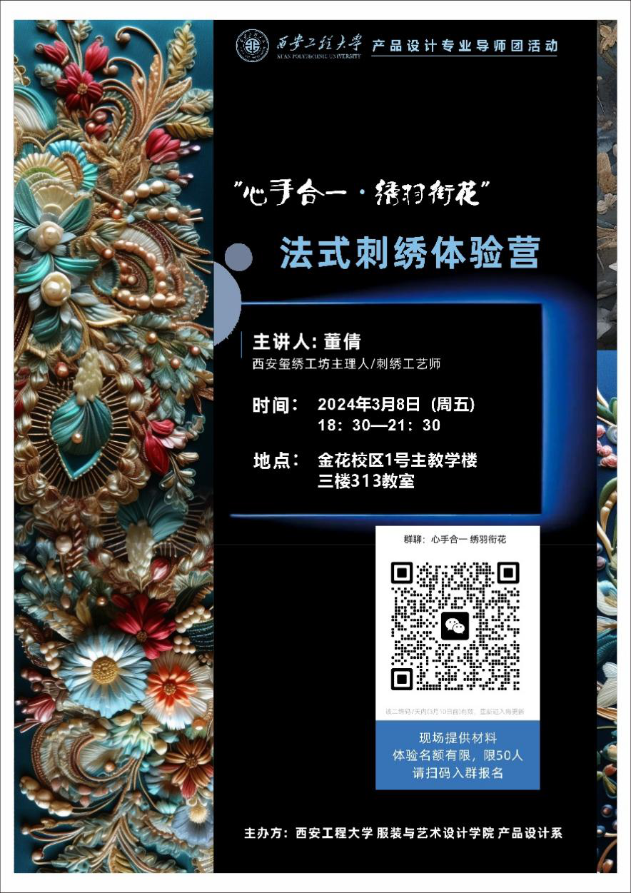 产品设计系三全育人导师团在金花校区教学1号楼313教室圆满举办了“心手合一 绣羽衔花”法式刺绣体验营活动。特邀西安玺绣工坊主理人董倩进行现场指导,产品设计系陈华主持活动,产品专业本科生、研究生等参加体验营。