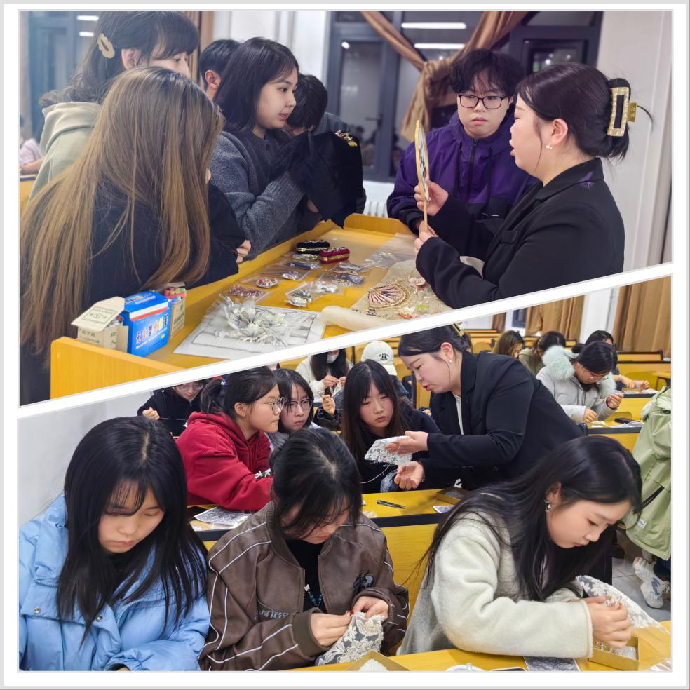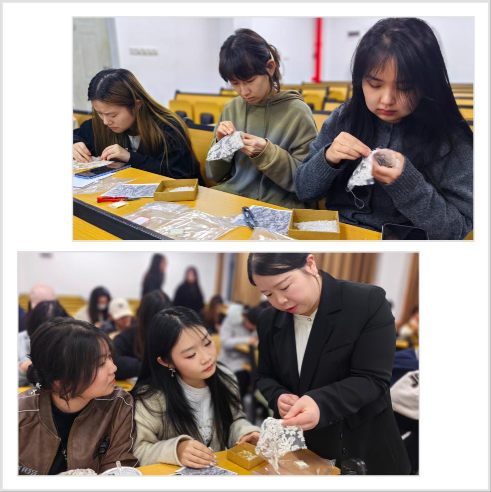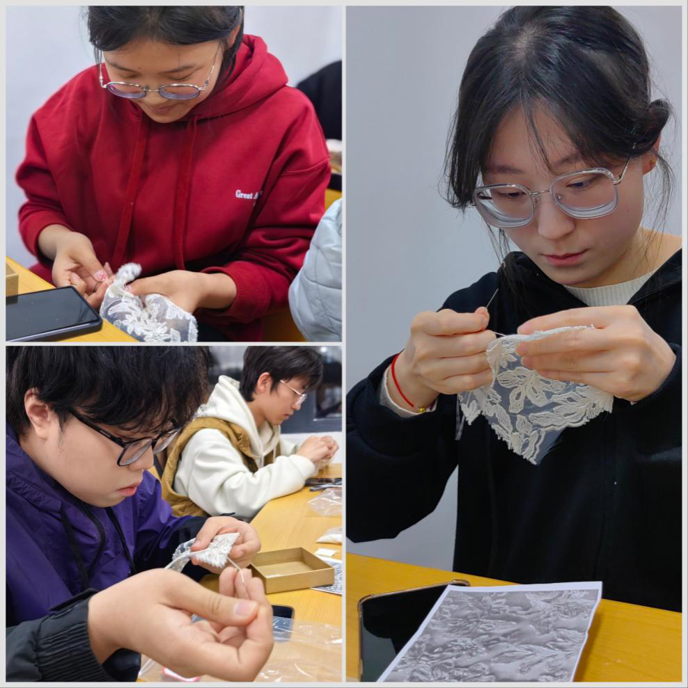活动伊始,董倩向学生们详细介绍了法式刺绣的历史渊源、技艺特点与美学价值。她表示法式刺绣不仅是一种装饰艺术,更是一种贵族文化的审美情怀的表达。在导师团的指导下,学生们动手尝试,亲身实践了法式刺绣的表现技法,用一针一线一珠绣出了唯美精致的图案。活动最后,学生们展示了自己的作品,导师团老师给予点评指导。学生们纷纷表示,这次活动为自己提供了一个学习交流的机会、一个展示才华的平台,为未来的职业方向展开了一个有益的可能性,导师团中肯的建议与热情的鼓励激发了学生们继续探索与创新的勇气与信心。