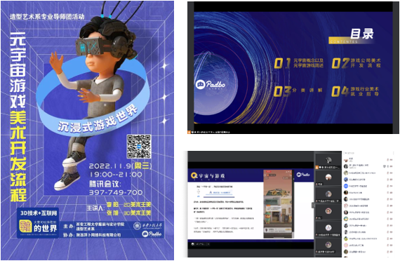 美术学专业三全育人导师团开展学术讲座,本次活动以腾讯会议的方式开展。此次讲座的主题为《元宇宙游戏美术开发流程》,主讲嘉宾为陕西湃卜网络科技有限公司的2D主美李阳以及3D主美张旭,会议由造型艺术系副主任李朝霞及造型艺术系秘书韩笑主持,美术学专业2019级、2020级、2021级三届300名学生及专业教师共同参与学习。