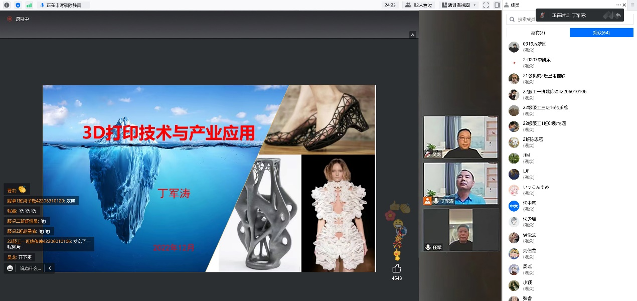 服装工程系于12月9日周五晚上19:30在腾讯线上会议召开主题为《3D打印技术与产业应用》的服装工程系专业导师团活动。此活动邀请渭南领智三维科技有限公司副总经理、高级工程师丁军涛,会议由服装工程系副主任吴龙老师主持,服装工程系师生60余人线上参加会议。