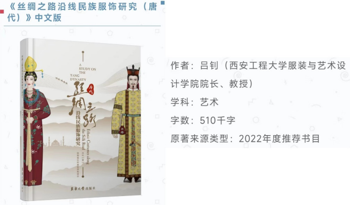 吕钊教授的著作《丝绸之路沿线民族服饰研究(唐代)》(东华大学出版社)入选书目,这是我校艺术类学术专著首次入选国家社科外译项目。中华学术外译项目是国家社科基金项目的重要类别之一,主要资助代表中国学术水准、体现中华文化精髓、反映中国学术前沿的学术精品,以外文形式在国外权威出版机构出版并进入国外主流发行传播渠道,旨在发挥国家社科基金的示范引导作用,深化中外学术交流和对话,进一步扩大中国学术的国际影响力,促进中外文明交流互鉴。
