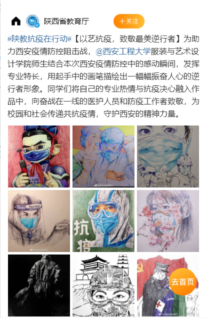 捷克论坛 视觉传达系“以艺抗疫,最美逆行者”主题抗疫作品被陕西省教育厅微博客户端转载,全文如下: