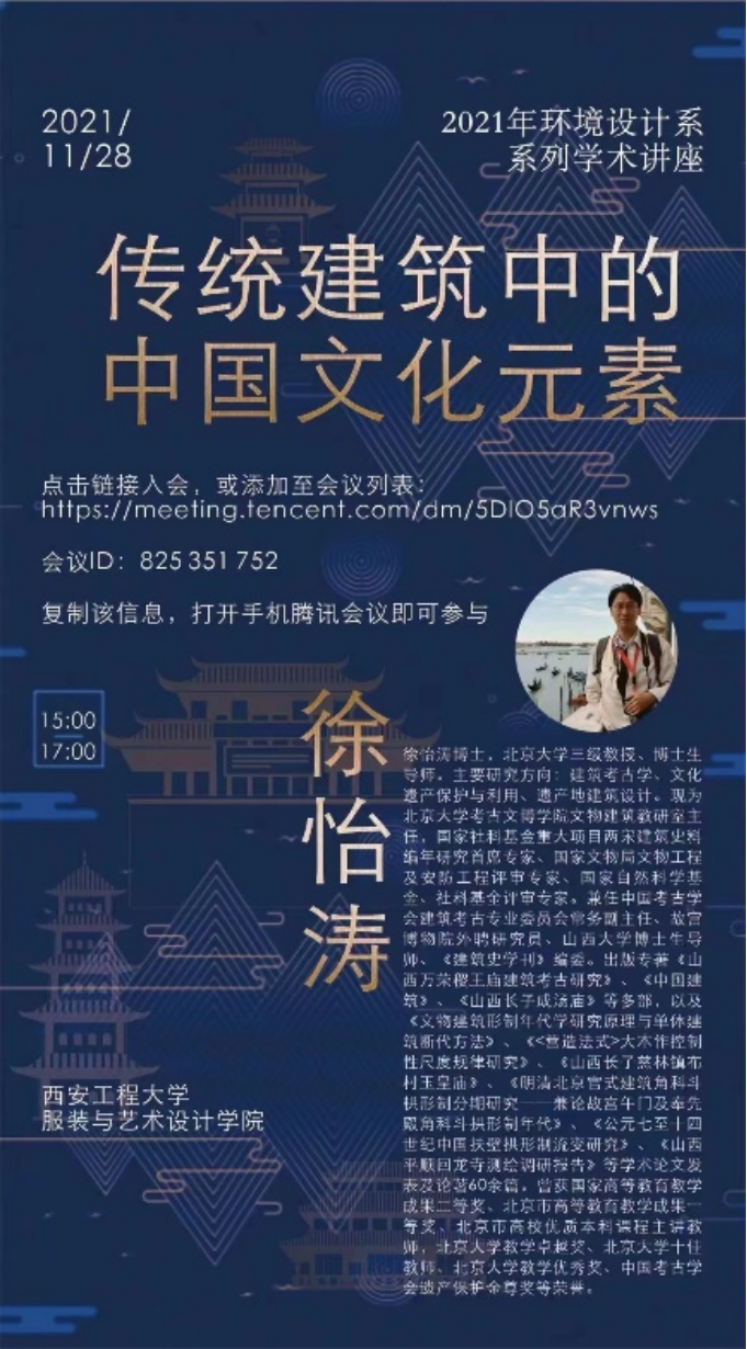 环境设计系举办系列专题学术讲座第一场。此次讲座邀请北京大学徐怡涛老师为环境设计系师生进行名为《传统建筑中的中国文化元素》的专题讲座。全体环境设计系教师、研究生、本科生参与了此次讲座。