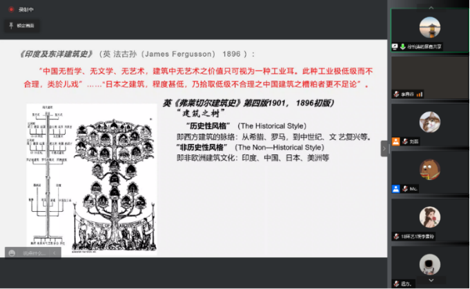 徐怡涛老师在讲座中,从他自身的专业出发,首先从英国学者对中国古代建筑价值出发、中西方文化中对中国古代建筑的评价入手,讨论中国古代建筑的价值,以及中日建筑之间关系。其中以英国学者对于建筑的分类,认为除去欧洲主流之外的建筑风格,都被英国学者认为是非历史性风格。随着西方观念的改变,西方学者认为东方、西方建筑同样是历史性的。