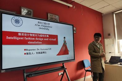 之后,“服装虚拟仿真与智能设计科研创新团队”负责人刘凯旋教授,做了《服装设计智能化与虚拟仿真》的报告。从“人体混合建模法”、“骑行服压力动态舒适性研究”、“服装智能合体性评估”、“服装款式与纸样智能设计”、“3D交互式服装纸样设计”、“3D古代服饰虚拟仿真”6个方面进行了介绍,并分享了挖掘研究创新点的方法与学术论文写作的经验。团队骨干教师薛媛副教授,从工科视角“聊”颜色,做了《颜色·研色》的报告,介绍了“色彩的学科特色”、“色彩的研究方向”、“色彩体系的研究”,分享了自身在该领域的相关研究成果,使大家对于色彩研究有了全新的认知。