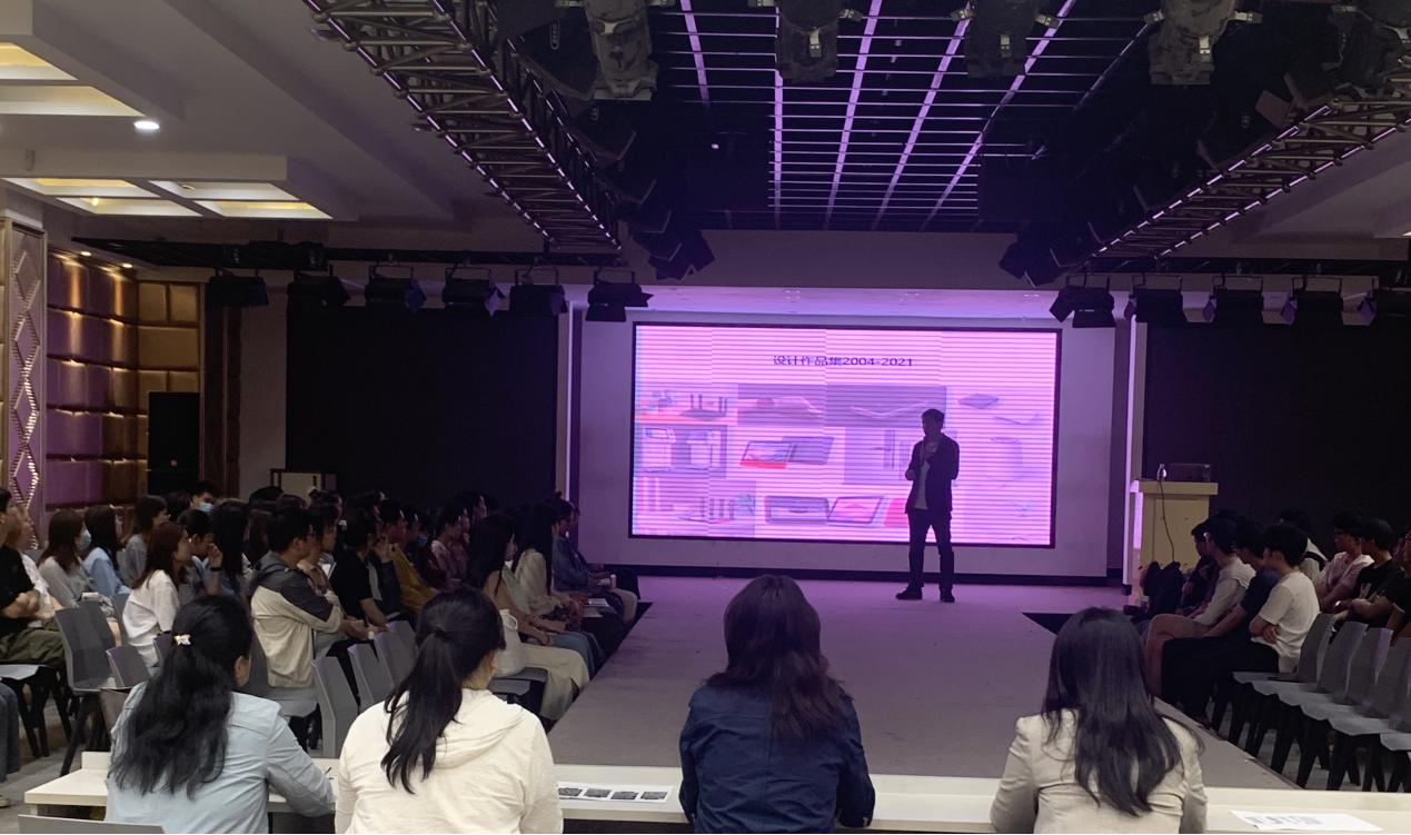 讲座伊始,刘立群先生分享了自己在工作期间的设计感悟,向大家展示了自己从事设计工作以来所获得的优异成果,分享了自己的从业经历。讲座中,刘立群先生分享了他的2021年IF国际设计大赛获奖作品,结合设计实践,通过“2s现象、三分钟原则、75%准则、二八原理、一脉相承”等关键词,对在校生讲述了“怎样设计一款优秀的产品”,他提出一个团队是优秀设计产出的基础,同时提到个人能力,在校生不仅要注重三维软件的掌握,也要注重二维表现,更要注重产品细节表达以及产品落地孵化的工艺成本等要素。他尤其强调了作为一个设计师,一定要学会表达,如何将自己的设计理念传达给团队成员、客户和老板至关重要。