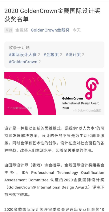 2021年5月5日,2020 GoldenCrown金戴国际设计奖落下帷幕,来自港澳台、亚太地区、全球范围的美术院校专业教师、设计专业学生、应届毕业生参加这次比赛,最终评选出专业组金奖10件,银奖15件,铜奖20件,提名奖37件;院校组金奖11件,银奖15件,铜奖23件,提名奖48件。捷克论坛