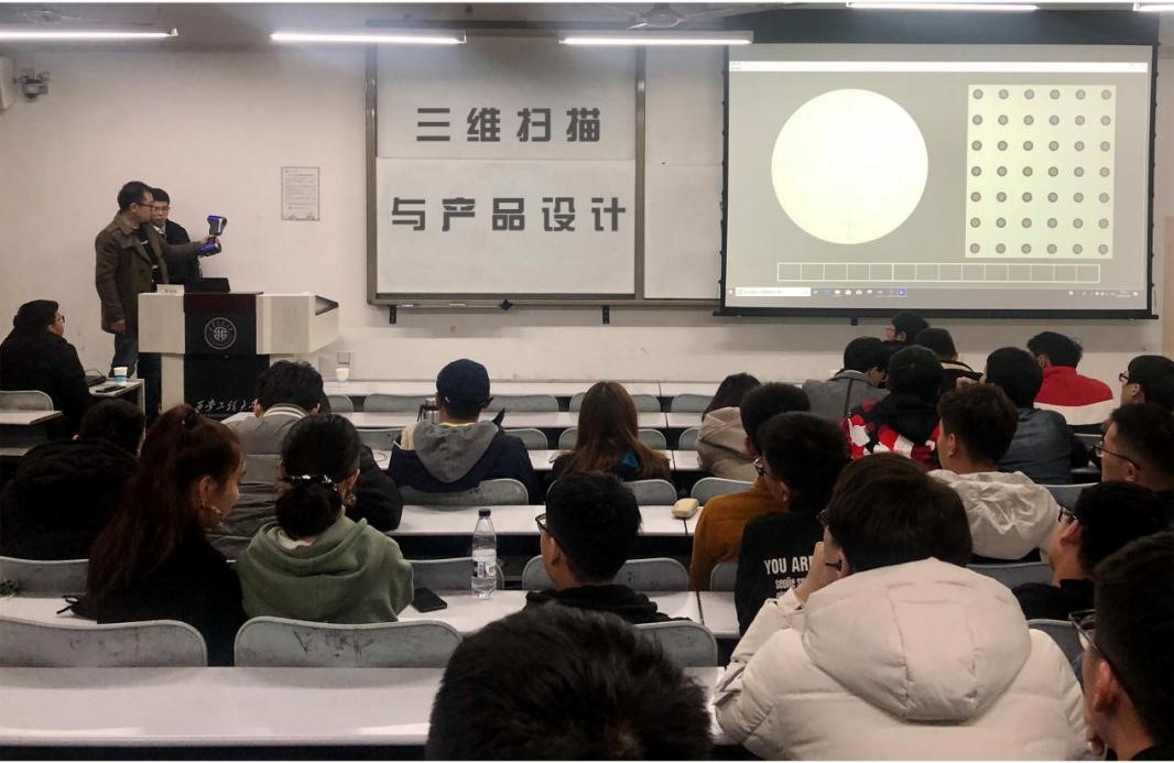 在讲座上,房旭鹏经理首先通过汽车造型的三维扫描实例介绍了三维扫描仪在产品开发设计中的作用,指出三维扫描仪作为一种快速的立体测量设备,因其测量速度快、精度高,非接触,使用方便等优点而得到越来越多的应用。用三维扫描仪对手板、样品、模型进行扫描,可以得到其立体尺寸数据,这些数据能直接与CAD/CAM软件接口,在CAD系统中可以对数据进行调整、修补、再送到加工中心或快速成型设备上制造,可以极大的缩短产品制造周期。其次介绍了三维扫描仪的种类、区别、适合应用的场景,针对手持式三维扫描仪应用的领域展开详细的说明,指出三维扫描在逆向工程、三维检测、有限元分析、3D打印、三维可视化、虚拟装配等方面具有重要的作用及优势。让同学们扫码观看现有的博物馆文物三维展示,并现场演示三维扫描过程,同时邀请同学上台操作体验。最后,对同学们提出的问题进行详细的解答。