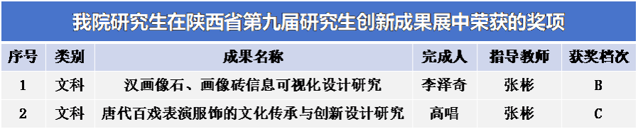 硕士研究生李泽奇成果《汉画像石、画像砖信息可视化设计研究》荣获B档奖项、硕士研究生高唱成果《唐代百戏表演服饰的文化传承与创新设计研究》荣获C档奖项,指导教师均为张彬教授。