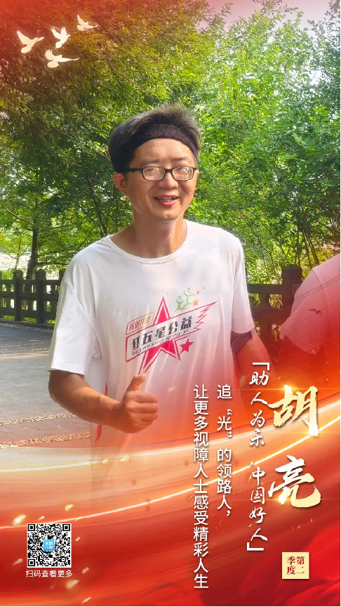胡亮,如同他的名字那样,把自身焕化成一丝微光,穿破黑暗,为青年大学生树立良好的榜样,引导人生的方向;为视障人士照“亮”前行的路,点“亮”梦想的灯塔。